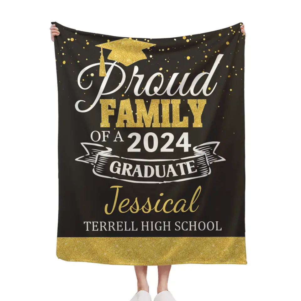 Produit disponible: Couverture personnalisée de nom d’école de remise des diplômes, fière famille d’un diplômé de 2024