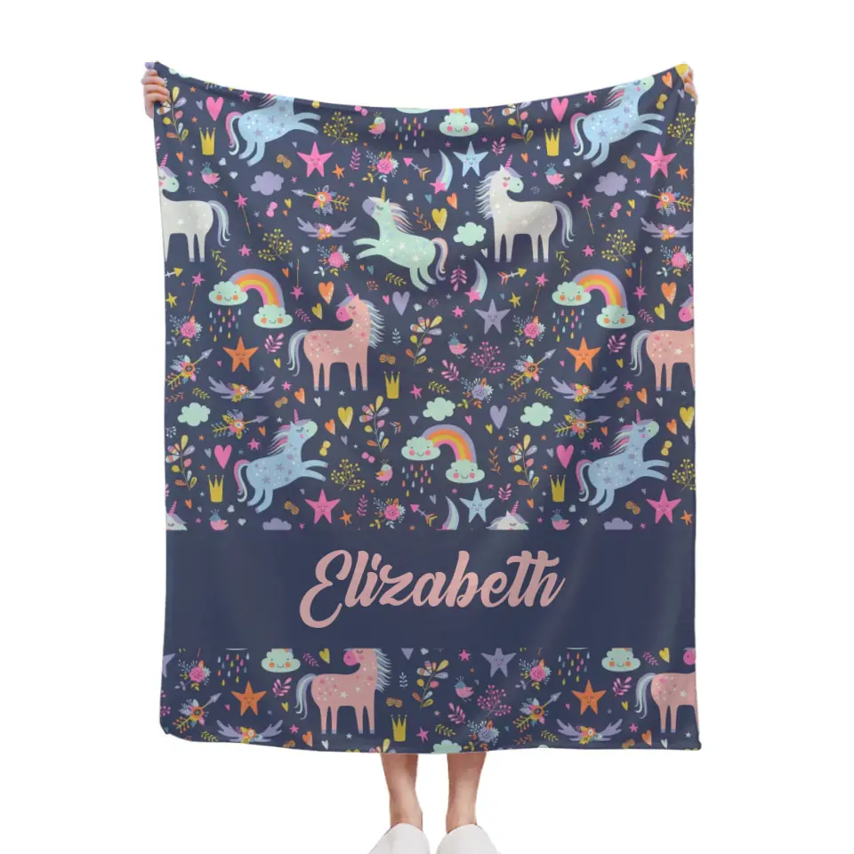 Couverture personnalisée avec nom personnalisé – Nuages, gouttes de pluie, étoiles arc-en-ciel, licorne