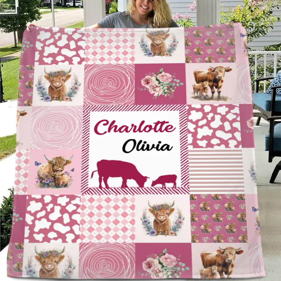 Available Product: Highland Cow - Personalised Name Pinkish Purple Blanket - A Gift For Child