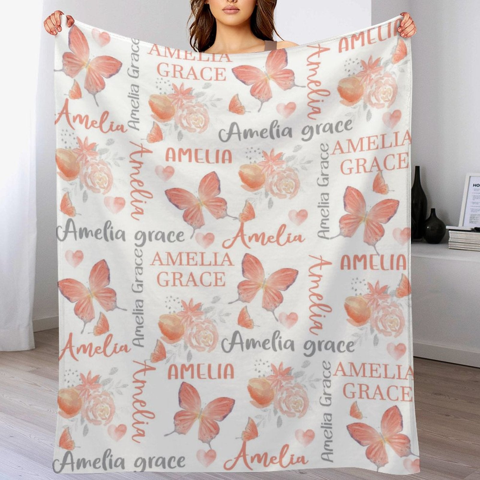 Livraison gratuite✈️Couverture personnalisée avec nom de bébé fille, motif floral corail papillon