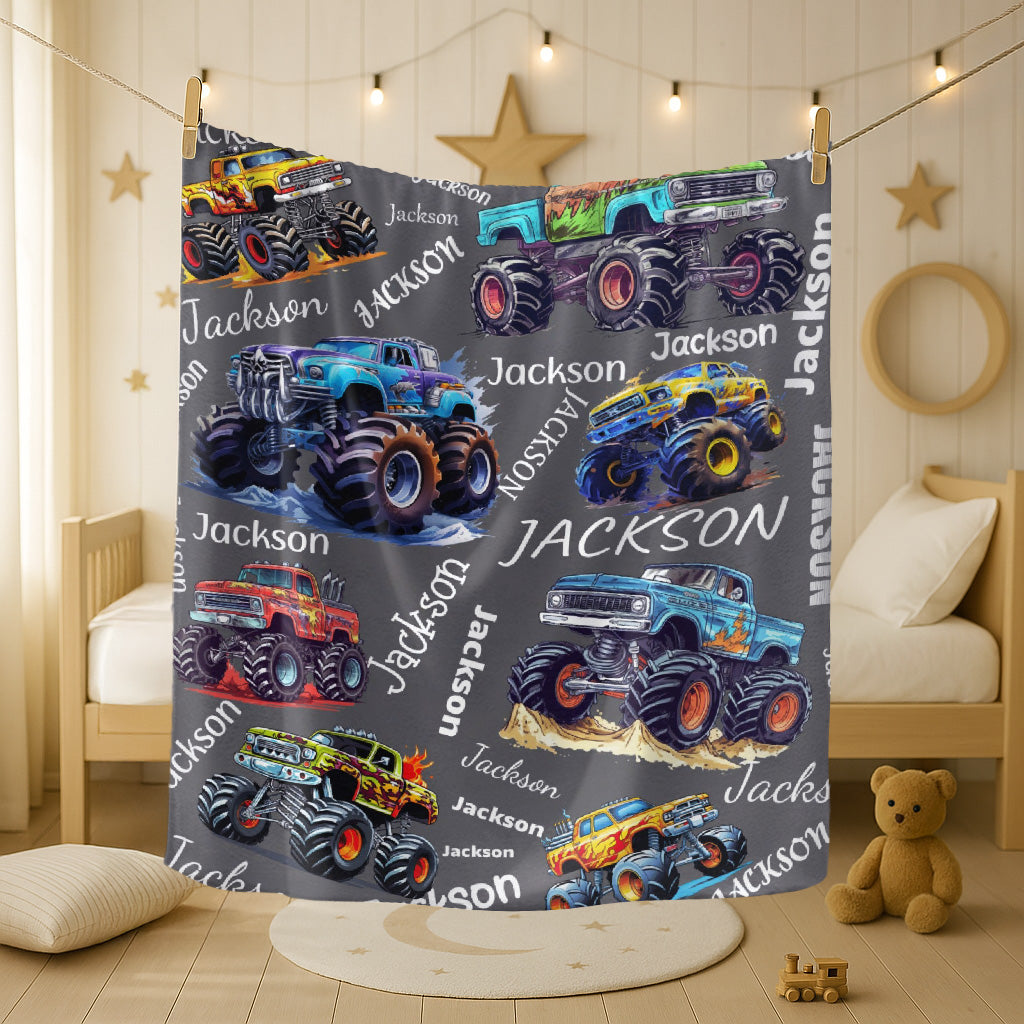 Livraison gratuite✈️Couverture personnalisée avec nom Monster Trucks pour enfants