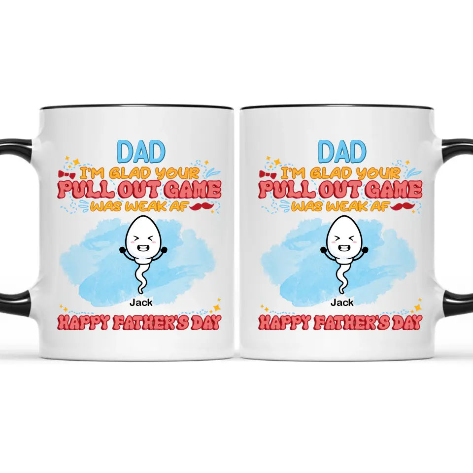 Produit disponible: Nous sommes heureux que votre jeu Pull Out soit faible, tasse drôle personnalisée, cadeau de la fête des Pères