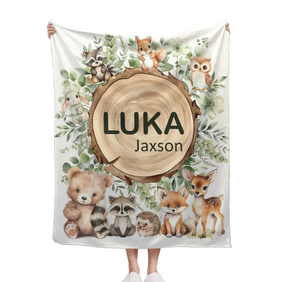 Produit disponible: Annonce de souche de forêt, couverture de nom de bébé, amis des petits animaux, animaux de la forêt, ours, renard, raton laveur, cerf