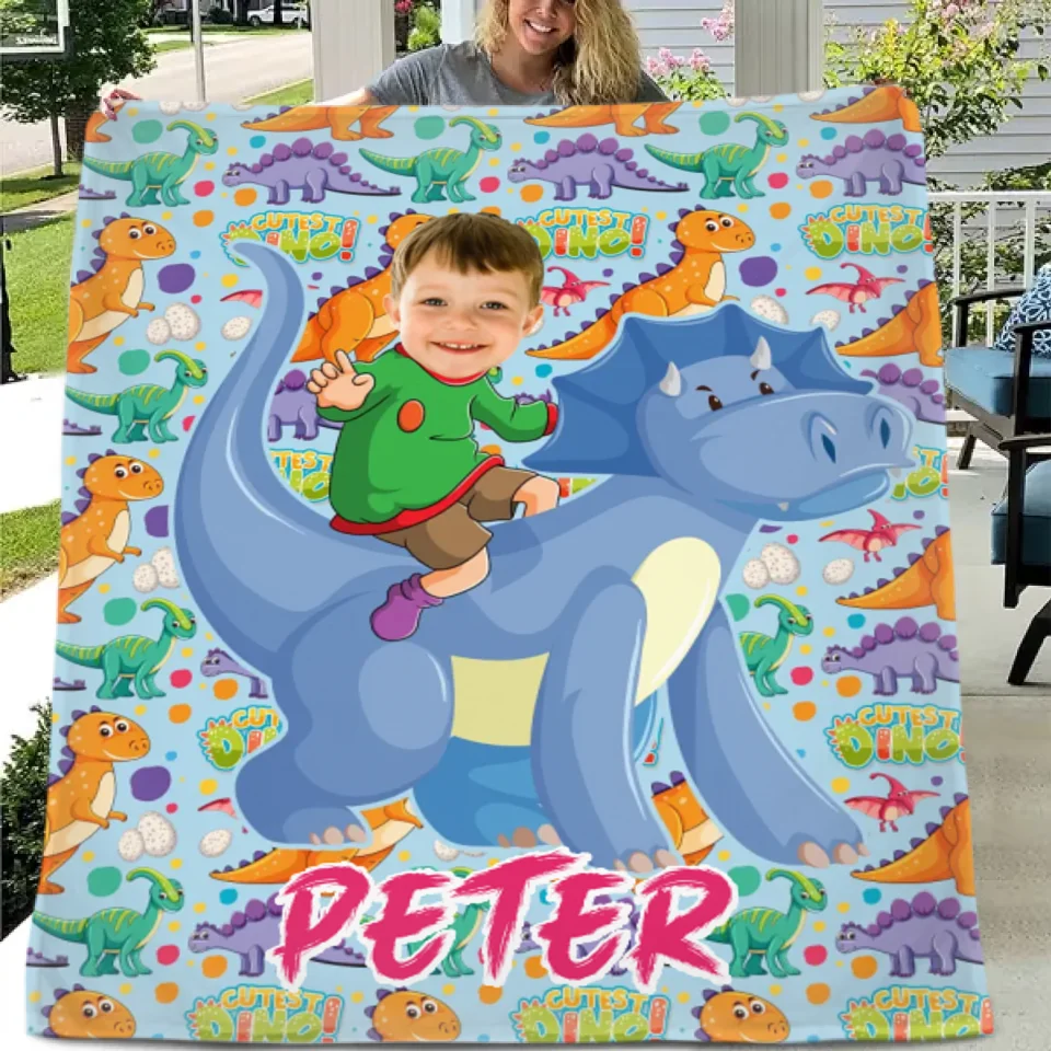 Bring your child's dinosaur adventures to life with our Personalized Dinosaur Blanket! Featuring your child's photo and name brilliantly integrated into an exciting scene of riding a friendly dinosaur, this custom blanket is perfect for sparking imagination and cozying up at bedtime.