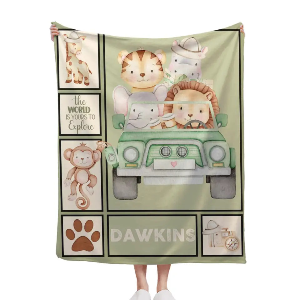 Available Product: Personalized Boys Name Blanket - Lion Tiger Animals Bedroom Decor, The World Is Yours to Explore
