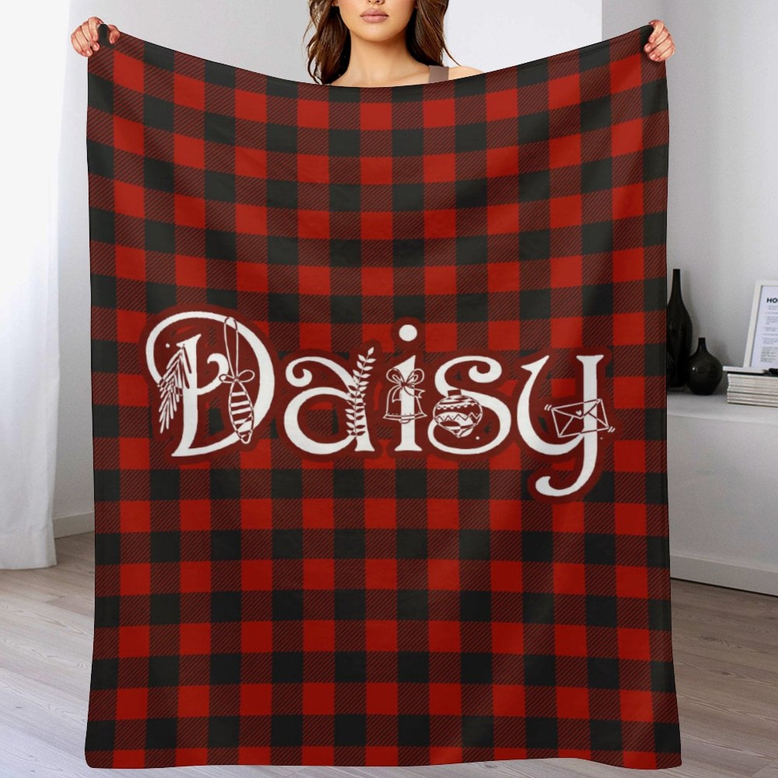 Personalized Buffalo Plaid Christmas Checkered Red Snowflake Name Blanket