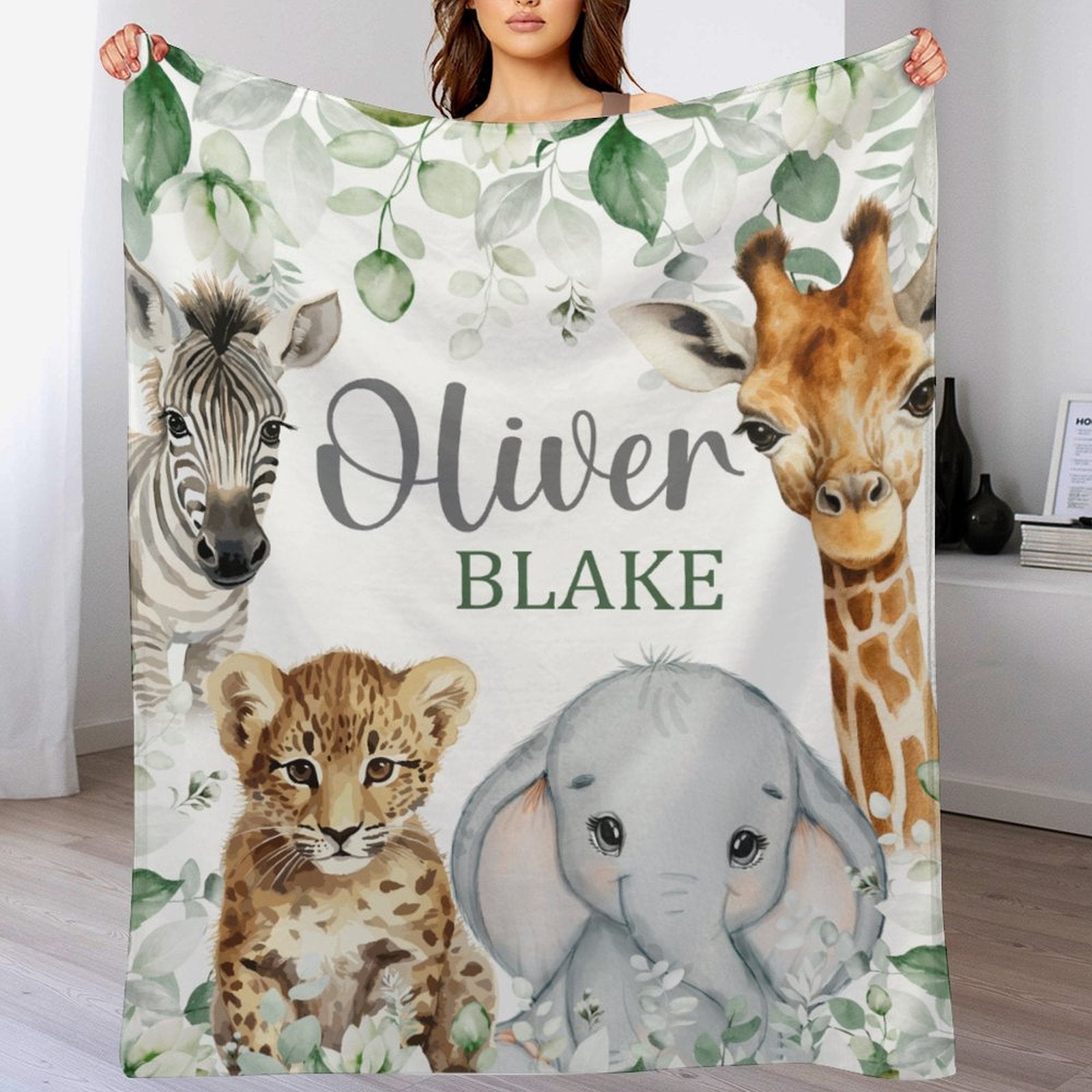 Safari Animals Baby Blanket, Jungle Greenery Eucalyptus Leaves Personalized Boy Girl Name Blanket